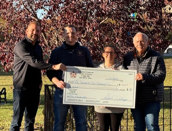 Van Wert FOP Lodge 62 is once again proud to support the Van Wert County Sheriff’s Office’s “Christmas with Kids” program with a $3,000 donation, along with a $500 donation to Main Street Van Wert’s “Holiday at Home.” Pictured above are FOP Chaplin Richard Shobe, Sheriff Thomas Riggenbach and FOP Treasurer Adam Wehage. Pictured below are Main Street Van Wert Executive Director Mitch Price,Wehage, Breann Sudduth and Shobe. Lodge officials said they’re honored to be able to assist with making the holidays a little brighter for children and their families, and they thanked all of FOP fundraiser supporters for their generosity. Photos submitted
