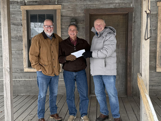 Kevin Merkle, on behalf of the late Harold and Janet Merkle, presented a $5,000 donation to the ongoing capital campaign project. The funds were presented in a fitting place – on the steps of the log cabin on the campus, a structure that dates back to the mid-19th century and once belonged to the Merkle family.