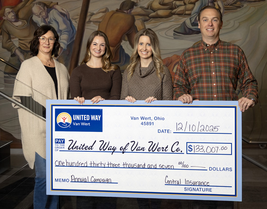 Central Insurance has completed its 2025-26 campaign for the United Way of Van Wert County, contributing an outstanding $133,007. This total includes $58,007 in employee pledges, matched by a generous $75,000 from the company. As the United Way’s longest-standing partner, Central Insurance’s support extends far beyond financial contributions. Employees actively participate in annual campaigns and fundraisers, and volunteer their time to many other organizations. This dedication directly strengthens the work of the 32 United Way funded agencies that provide essential services and resources to individuals and families throughout Van Wert County. Pictured from left to right are Tracey Lautzenheiser, Central Insurance/United Way board member; Amelia Clouse – Central Insurance/United Way board member; Ashley Bultemeier, United Way Executive Director, and Central Insurance Chairman, CEO and President Evan Purmort. Photo submitted