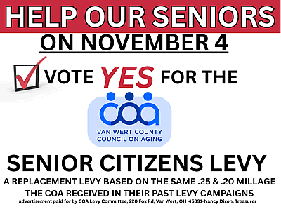 A final reminder – that the close of registration for the November 4, 2025 general election is Monday, October 6. The Van Wert County Board of Elections office is located at 1362 E. Ervin Rd., Van Wert, and will be open from 8:30 a.m. to 9 p.m. on October 6. Normal hours are Monday-Friday 8:30 a.m. to 4 p.m.