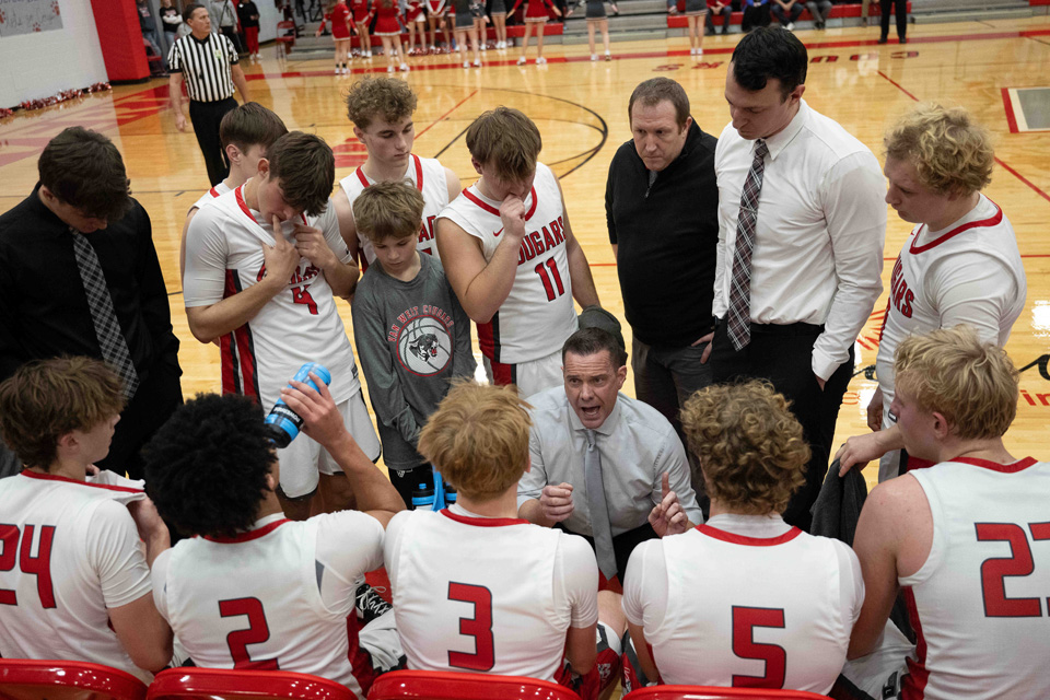 Van Wert boys basketball coach Jeremy Best gives his team instructions during Friday’s WBL game against Defiance. The pep talk worked, as the Cougars won the game 47-35. Lincolnview and Crestview also posted wins on Friday. Game stories can be found on the Sports page. Bob Barnes/VW independent