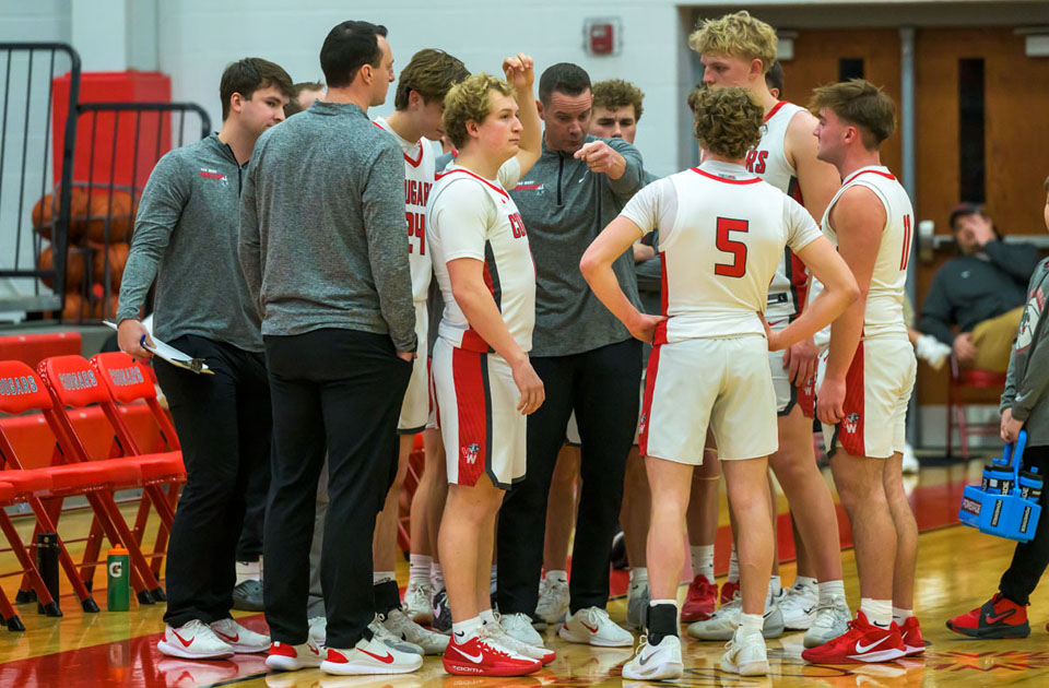 Van Wert boys basketball coach Jeremy Best (center) gives the Cougars instructions during a timeout. Van Wert hosted Coldwater Saturday night and the Cougars got off to a fast start but lost 57-48, which snapped a six-game winning streak. A game recap can be found on the Sports page. Bob Barnes/Van Wert independent