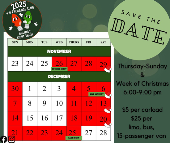 The 4-H Exchange Holiday Light Show serves as the club’s primary annual fundraiser. Proceeds support travel and hosting costs for the Exchange Club program, which provides opportunities for local youth ages 13–18 to connect with 4-H members from other states, experience new cultures, and build lifelong memories.