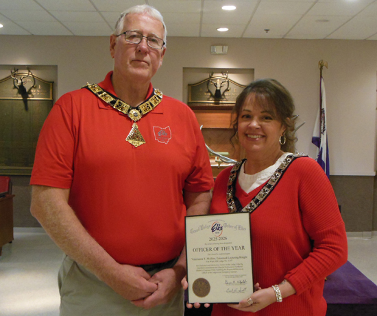 Van Wert Elks Lodge No. 1197, Benevolent and Protective Order of Elks recently honored their “Officer of the Year” for the 2025-2026 Lodge year. Selected as the “Officer of the Year” was Valerianne Mullins, Lodge Lecturing Knight. In addition to her lecturing knight duties, she served as the children’s Christmas party chairman as well as promoting other events. Mullins (pictured above with Lodge Exalted Ruler John Ream) received a framed certificate from the Grand Lodge, which was signed by the Grand Exalted Ruler (National President) Bryan R. Klatt. Photo submitted