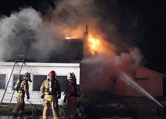 No one was apparently injured in a house fire that occurred at 208 Balyeat Ave. Sunday evening. According to reports at the scene, residents of the dwelling came home and opened the door, only to find smoke pouring out of the structure. A 9-1-1 call was received at 7:20 p.m. and Van Wert firefighters were on the scene in minutes. More information will be published as it becomes available. Above, firefighters work on the blaze from the front of the house, while the back of the house was also afire (below). Photos by Dave Mosier/Van Wert independent