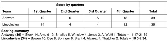 But the crucial game statistic was free throw shooting. While the Lancers didn’t make either of their two free throw attempts, Antwerp had 21 attempts at the charity stripe and knocked down 17 of those (81 percent).