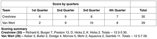 The Cougars began creeping up in the third quarter, outscoring Crestview 10-8 to trail by a basket, 23-21, as the fourth quarter began. Van Wert again outscored the Knights, but only by a point, in the final quarter as Crestview did just enough to get out of town with the victory.