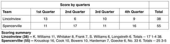 Also Friday, Lincolnview started out good, but two bad quarters meant the difference between winning and Spencerville, which won the Northwest Conference contest 55-38 at Spencerville.