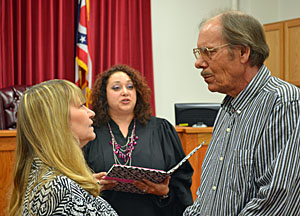 A couple who divorced after years of being together took another stab at marriage in a Valentine’s Day ceremony officiated by Van Wert Municipal Court Judge Jill Leatherman. Dave and Lori Burnett, who married June 4, 1986, after being together for a decade before that, divorced in 2003, but said they couldn’t stay apart and decided to remarry this year. The re-Mrs. Burnett said it was her husband who decided that it would be nice to marry on Valentine’s Day this time. The couple’s two children said it was about time their parents decided to remarry. (Photos by Dave Mosier/Van Wert independent)