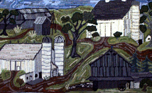 Much of the charm of hooked rugs comes from the colors chosen by the artists which range from muted, earthy tones to bright colors.  The pictures on the rugs are charming — some rugs have folk art themes, others, like the “Family Barns” rug, depict realistic objects or scenes.