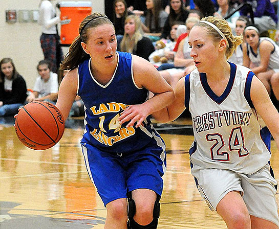 Although it’s often a cliché that records don’t matter when tournament time comes, that was the case Wednesday when the Lincolnview Lady Lancers (2-7 NWC, 7-13 overall) downed the Crestview Lady Knights (7-2 NWC, 11-9 overall) 38-27 to advance in the Division IV sectional tournament at Parkway High School. Above, Lincolnview’s Katie Dye (14) drives against the Knights’ Jessica Burger (24). At the Division III sectional at Van Wert, Parkway downed Fairview 61-47, while Lima Central Catholic defeated Paulding 60-47. (Jan Dunlap/Van Wert independent)