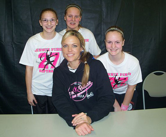 Van Wert Middle School girls traveled to Monroe, Mich., recently to learn from the best in the sport of softball. Kelsey Spridgeon, Abbi Spridgeon and Kateri Steinecker attended a weekend camp hosted by Olympic gold and silver medalist Jennie Finch, along with other Olympics, professional and collegiate players. The local girls were among 315 girls from seven states and two countries who participated in the camp. Shown are (from the left) Abbi Spridgeon, Jennie Finch (seated), Kateri Steinecker and Kelsey Spridgeon. (photo submitted)