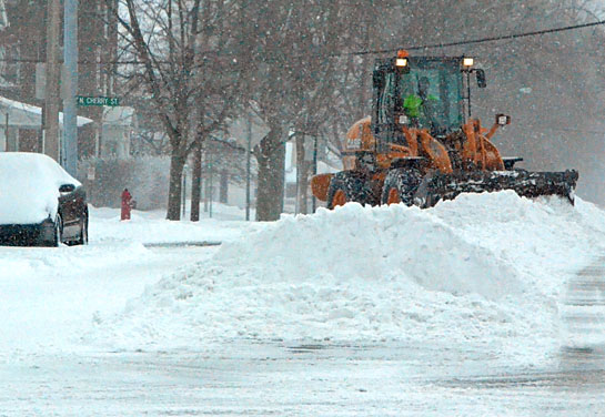 This snowplow is moving some of the 6.2 inches of snow that fell overnight Thursday and Friday morning on East Main Street in Van Wert. The more than 6 inch total brings the total snowfall this winter to 43.65 inches, the highest total since the period November 2002-March 2004, when 55.05 inches of snow fell. Before that, one has to go back to the winter of 1983-84 to find more snowfall (57 inches). Another inch or two is also possible today, said County Emergency Management Director Rick McCoy, who added that flooding will be the next major concern in the county when what is predicted to be heavy rain hits Sunday evening through Monday. (Dave Mosier/Van Wert independent)