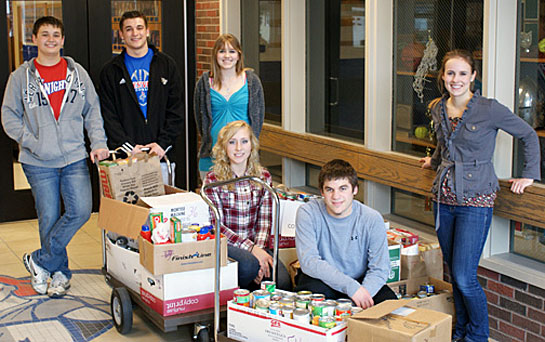 Crestview collected food last week for a food drive competition with Lincolnview. The event was sponsored by the Northwest Region of the Ohio School Boards Association. The Crestview junior-senior high and elementary collected 1,150 food items, which were donated to the Convoy Food Pantry. The pantry is a very important venue for the community as it served more than 200 different families in 2010 alone. For its efforts, the school district will receive an award at the OSBA conference on March 10. Shown with the food collected are senior members of the Crestview Student Council (from left) Clay Nofer, Joey Overmyer, Shelby Minnich, Jessica Burger, Jacob Wortman, and Erika Frey. (Crestview photo)