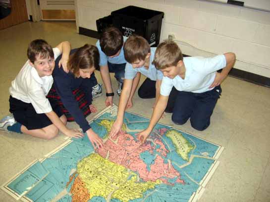 students put puzzles cut from maps together. Pictured assembling a map of the United States and Canada are Risa Pollock, Erienne Cassidy, Ezra Friesner, Mason McHugh and Jacob Lautzenheiser.