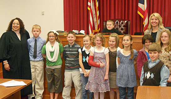 Earlier this week, students in Van Wert City Schools’ fourth grade enrichment class got a chance to see what a court trial is really like, as students first toured Van Wert Municipal Court and then held a mock trial titled, “State vs. Goldilocks.” Students played the roles of judge, defense attorneys, prosecutors, witnesses, court bailiff and jury during the trial. The jury also heard several witnesses, including three members of the Bear Family. Students from Van Wert High School’s TV Production Class also covered the event for Channel 6. Shown here are class member and teacher Michelle Turnwald with Municipal Court Judge Jill Leatherman. (photo submitted)