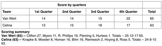 Clifton was the Cougars’ — and the game’s — top scorer with 27 points, including a 7-of-7 performance at the free throw line. Reggie Phillips also had a huge game, scoring a career-high 19 points, while Myers added 11 points for Van Wert.