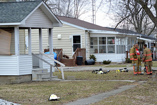 Ohio City firefighters rest after quickly knocking down a fire at 505 Koch St. in that village on Sunday afternoon. One person was reportedly trapped in what was then a smoke-filled house and was later taken to Van Wert County Hospital for treatment. In addition to the Ohio City Fire Department and EMS, other agencies at the scene included Brickner's Ambulance Service, the Ohio City Police Department, Van Wert County Sheriff's Department and the Van Wert County Chapter of the American Red Cross. (Dave Mosier/Van Wert independent)