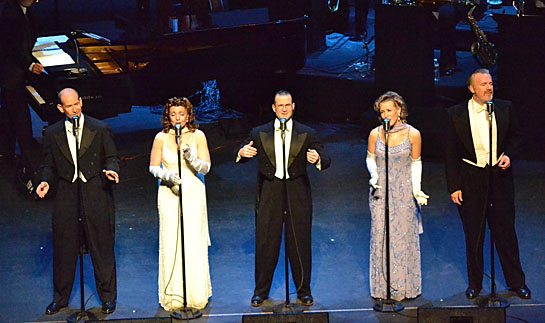 The members of Five By Design (Lorie Carpenter-Niska, Sheridan Zuther, Kurt Niska, Michael Swedberg and Terrence Niska) are dressed to the nines as they recreate the Big Band Swing era, with the aid of an eight-piece orchestra, at the Niswonger Performing Arts Center of Northwest Ohio on Friday night. (Dave Mosier/Van Wert independent)
