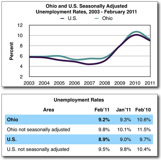 Ohio’s unemployment rate was 9.2 percent in February, down slightly from the revised 9.3 percent in January, according to data released Friday morning by the Ohio Department of Job and Family Services (ODJFS). Ohio’s nonfarm wage and salary employment increased 13,600 over the month, from the revised 5,068,300 in January to 5,081,900 in February.