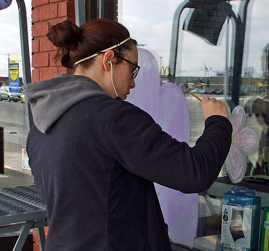 Van Wert High School sophomore art student Hannah Fraser is shown painting the storefront windows of P&R Medical Connection in hopes of putting a smile on people's faces after such a long winter! Ginger Rahrig, P&R manager, would like to recognize Hannah, who will be traveling to Australia for 16 days this summer on the adventure of a lifetime as a member of the student ambassador program. Anyone interested in information on donating to Hannah's trip expense may call P & R Medial Connection at 419.238.9828. (photo submitted)