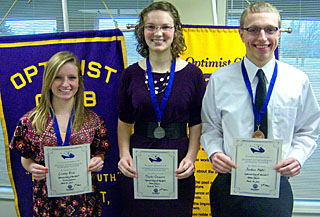 Three Van Wert High School students were honored during the March 10 Optimist Club meeting while presenting their essays. Linzey Rice won first place and was awarded a $200 check and gold medallion. In addition, her winning essay was submitted to the district level to be judged. Taylor Grooms finished in second place and was awarded a $100 check and silver medallion. Third place was awarded to Jordan Mohr, who received a $50 check and a bronze medallion.