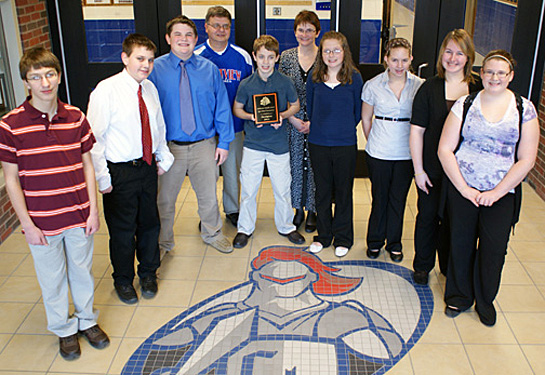 The Crestview Junior High Scholastic Bowl Team wrapped up their season Saturday going 8-0 on the day and winning the Coldwater Middle School Quiz Bowl Championship. The team defeated Van Wert in the final round to bring home the trophy and finish the season with an outstanding 22-7 overall record. Shown (from the left) are Noah Daugherty, Brett Ripley, Carter Brown, Junior-Senior High School Principal Mike Biro, Corbin Schumm, Coach Sandy Grooms, Hali Finfrock, Layken Klinger, Bekka Tracey, and Taylor Hughes (Not picture are team members Payton Schaadt and Victoria Callow). (Crestview photo)