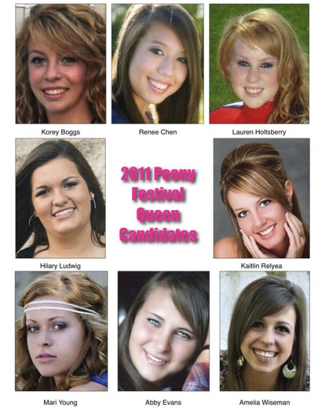 Eight area high school senior girls will be competing for the title of Queen Jubilee XXXVI when the Peony Festival Pageant takes place Friday, April 1, starting at 7:30 p.m. Doors open at 6:30 that evening.