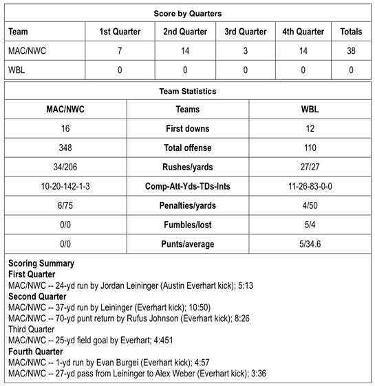 Top receivers for the MAC/NWC team included Burgei, with two receptions for 58 yards, and Weber with 57 yards and a TD on two carries. Kenton’s Andrew Tillman was the WBL’s top receiver with 37 yards on five receptions, while Morrison caught four passes for 27 yards and the Wildcats’ Dustin Howell had one reception for 22 yards.