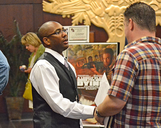 Van Wert Independent Film Festival founder and Executive Director Len Archibald greets a film buff during Friday’s events at the Niswonger Performing Arts Center of Northwest Ohio. Friday’s events included the screening of a number of film shorts, as well as the acclaimed Superheroes. A midnight screening of Glenn Berggoetz’ The Worst Movie EVER! was also held at Van Wert Civic Theatre. Today’s events include breakfast with Theodore James, producer of Superheroes, at 9 this morning at The Pitt Stop, and film screenings at the NPAC, starting at 9 a.m. with French film Mortem and ending at 11 with A Lonely Place for Dying, an American film. (Dave Mosier/Van Wert independent)