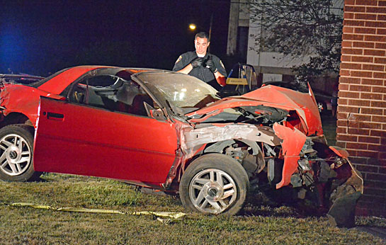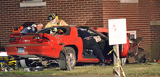 A Rockford man made a possible impaired driving citation even worse by trying to flee from the officer who attempted to stop him in the 300 block of North Race Street early Sunday morning. Gabriel Spradlin, 26, was listed in fair condition earlier this morning at Parkview Hospital in Fort Wayne, Ind., with injuries sustained when his car hit a utility pole and house about 2:30 a.m. Sunday. A Van Wert police officer attempted to stop Spradlin’s 1995 Chevrolet Camaro on suspicion of impaired driving in the 300 block of North Franklin Street, but Spradlin took off at a high rate of speed south on Race Street. The car became airborne when it crossed the railroad tracks at Jackson Street and Spradlin began to lose control of the vehicle as it crossed Main Street. The car was completely out of control by the time it got to Central Avenue, where it hit and broke off a stop sign and a power pole before hitting a residence that had once housed nurses who trained at the former Van Wert County Hospital (above). Spradlin, who was trapped briefly in the vehicle, was freed by Van Wert Fire and EMS personnel (below) and first taken to Van Wert Hospital and then to Parkview. The crash is still under investigation by troopers from the Van Wert Post of the Ohio State Highway Patrol and alcohol is believed to be a factor. Charges are pending. (photos by Dave Mosier/Van Wert independent)