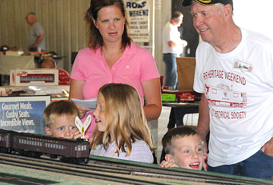 Everyone’s smiling — both adults and children — as they look over some of the model railroad displays at the 2011 Railroad Heritage Weekend event, hosted by the Van Wert County Historical Society at the county fairgrounds (click here for more Railroad Heritage and Hamfest photos). (Jan Dunlap/Van Wert independent)