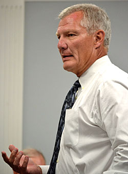 Pete Weir (standing) gives a presentation on the city trash problem, while representatives of several city trash collection companies listen. (photos by Dave Mosier/Van Wert independent)