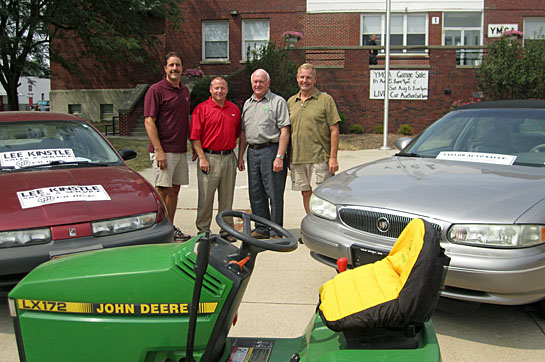 Seen here behind the items to be auctioned are (from the left) YMCA Executive Director Hugh Kocab, with those who donated the items: Eric McCracken of Lee Kinstle GM Sales and Service, Bruce Kennedy of Kennedy-Kuhn, and Gary Taylor of Taylor’s Auto Sales. (YMCA photo)