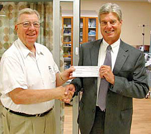 Van Wert County Foundation Executive Secretary Larry Wendel (left) presents a check for $50,000 to Van Wert County Hospital President/CEO Mark Minick as a portion of the foundation's ER project pledge. (VWCH photo)