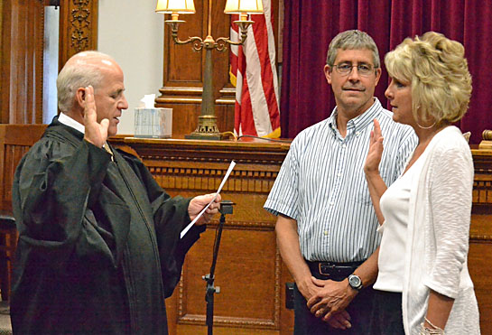 Van Wert County Common Pleas Judge Charles D. Steele (left) administers the oath of office to newly-appointed County Recorder Kim Hughes, while Hughes’ husband looks on. Hughes, who has 11 years experience as a deputy recorder, was appointed Thursday by the County Republican Central Committee to replace Jan McIntosh, who retired after more than 30 years in the recorder’s office, seven of those as recorder. (Dave Mosier/Van Wert independent)