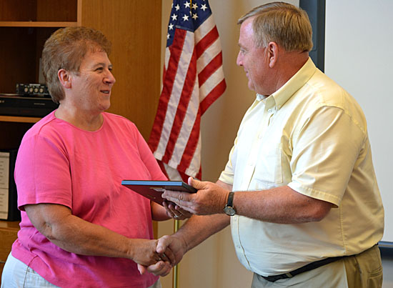 Retired Food Service supervisor Linda Springer gets a plaque from Crestview Superintendent Mike Estes during the district's August board meeting on Monday. (Dave Mosier/Van Wert independent)
