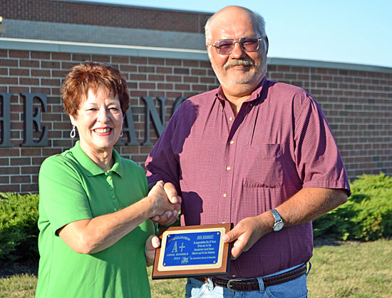 Retiring Lincolnview employee Jan Kimmey (left) receives a plaque from Board President Ron Davis in recognition of her 22 years of service to the district. (Dave Mosier/Van Wert independent)