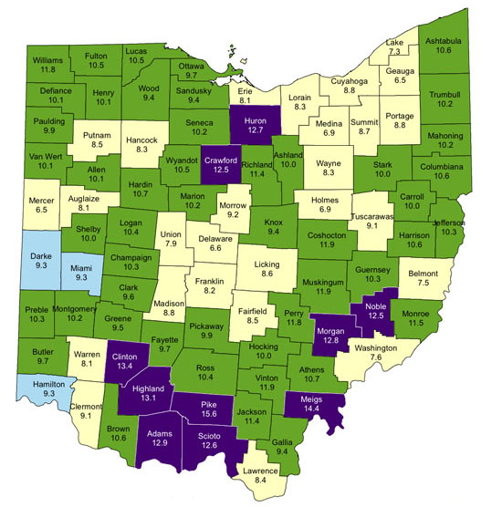 Ten counties had unemployment rates above 12.0 percent during July. The counties with the highest rates, other than Pike, were: Meigs, 14.4; Clinton, 13.4; Highland, 13.1; Adams, 12.9; Morgan, 12.8; Huron, 12.7; Scioto, 12.6; and Crawford and Noble, 12.5 percent.