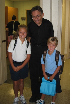 The first day of school at St. Mary of the Assumption School was exciting. Students arrived with bright shining faces, neatly dressed in their school uniforms and many were sporting new shoes. Joining our school are 17 Kindergarten students and Father Stan who is pictured with Jaden Spray, returning to start fourth grade, and her brother, Tyler, in Kindergarten.