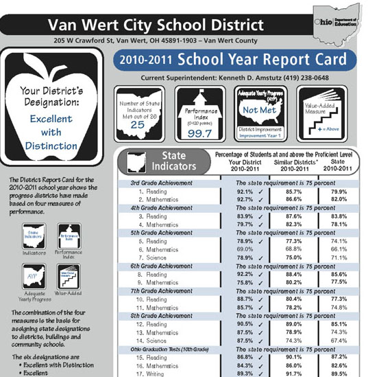 Superintendents of the county districts were pleased with their State Report Card rankings, which included all three districts meeting 25 of the possible 26 state indicators. All three districts fell down on one math standard, with Crestview (narrowly) and Van Wert fifth-graders failing to meet the state math indicator and Lincolnview eighth-graders missing the 75-percent math score cut-off, but not by much.