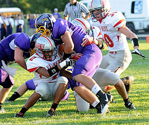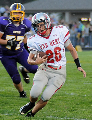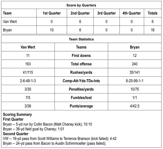 Van Wert generated most of its offense on the ground, running 41 times for 115 yards, while the Golden Bears had a more balanced offensive attack, running 35 times for 141 yards and completing 8 of 25 passes for 99 yards, a TD and one interception for a total of 240 yards of offense. Williams hit 2 of 6 passes for 48 yards and a touchdown, but the Bryan defense also picked off three passes.