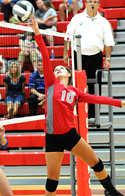 The Lady Cougars jumped out with a lead to begin the second game, but Delphos came storming back. However, Ashlee Dowdy’s ace serve, Danielle Hitchcock’s blocking and Molly Gamble’s hitting led the Cougars to the second game win of 25-21.