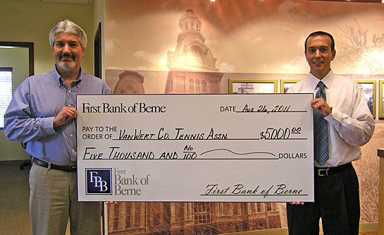 Rob Gamble, branch manager of the Van Wert Office of First Bank of Berne, presents John White, capital campaign chairman of the Van Wert County Tennis Association, with a check for $5,000 to be used for the construction of a new tennis complex in Van Wert. “The association is very grateful to Rob and First Bank of Berne for their generous contribution,” said White. Construction began August 29 on the tennis complex and is expected to take six to eight weeks. Once completed, the courts will be open to the public, as well as used for school matches and physical education. (FBB photo)