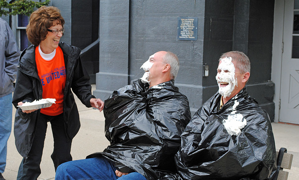 Diane Fisk of First Financial Bank surveys her handiwork after giving Commissioner’s Clerk Larry Clouse (left) and County Commissioner Thad Lichtensteiger a pie in the face on Friday. The pie-throwing was the culmination of a food collection challenge between county government workers and downtown businesses as part of this year’s United Way Day of Caring. The event, which included food and blood drives on Friday, will culminate today with a variety of projects taken on by local businesses and organizations to help United Way member agencies. (Cindy Wood/Van Wert independent)