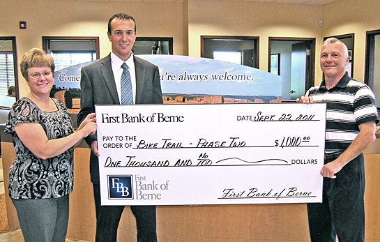 First Bank of Berne of Van Wert recently made a generous monetary donation of $1,000 to the Van Wert County Park District for Phase II of the planned bike trail. Shown above is teller Connie Bassett, assisted by Branch Manager Rob Gamble of First Bank of Berne. They are presenting the donation check to Bill Swank of the Van Wert Park District. Swank was very grateful and thanked FBB on behalf of the park district. He said he was excited to receive the donation for the bike trail project. (FBB photo)