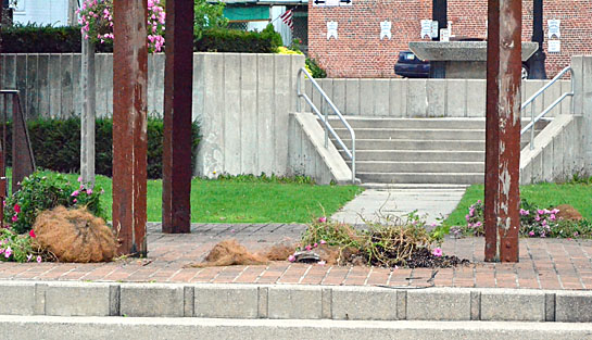Vandals did some damage in Fountain Park overnight, according to Van Wert Parks and Recreation Director Sue Heppeard. Heppeard said planters were torn off poles (some are shown on the ground in the gazebo above), others at the Band Pavilion were knocked over and lights were broken at the Rotary concession stand. Anyone with information on the incident should call the Van Wert Police at 419.238.2462 or Crime Stoppers at 419.238.STOP (7867). (Dave Mosier/Van Wert independent)