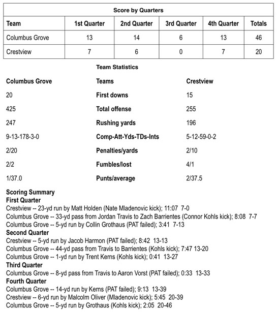 CONVOY – It wasn’t a great homecoming celebration for the Crestview Knights, who lost 46-20 to perennial grid power Columbus Grove in a Northwest Conference contest played Friday at Crestview.