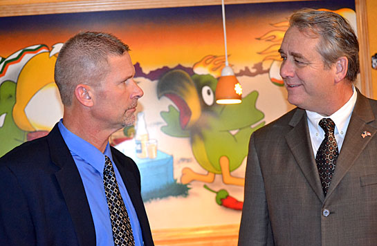 Ohio Auditor of State Dave Yost (right) was in town Friday and sat down for a luncheon meeting at Mi Ranchito restaurant with Van Wert County Commissioner Thad Lichtensteiger. Yost is traveling the state seeking input from local officials on financial issues at the state level. (photo by Lisa Mosier for the Van Wert independent)