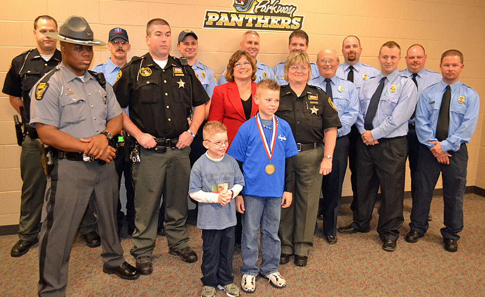 Parkway student Jayden Black and his younger brother, Keaton, pose with a number of first-responders following an assembly at Parkway to honor Jayden for his efforts in saving his brother’s life from drowning on July 31 (see story further down the page). Also in the photo is Van Wert County 9-1-1 Coordinator Kim Brandt, who honored the boy with a 9-1-1 Hero medal and a t-shirt for his actions. (Dave Mosier/Van Wert independent)
